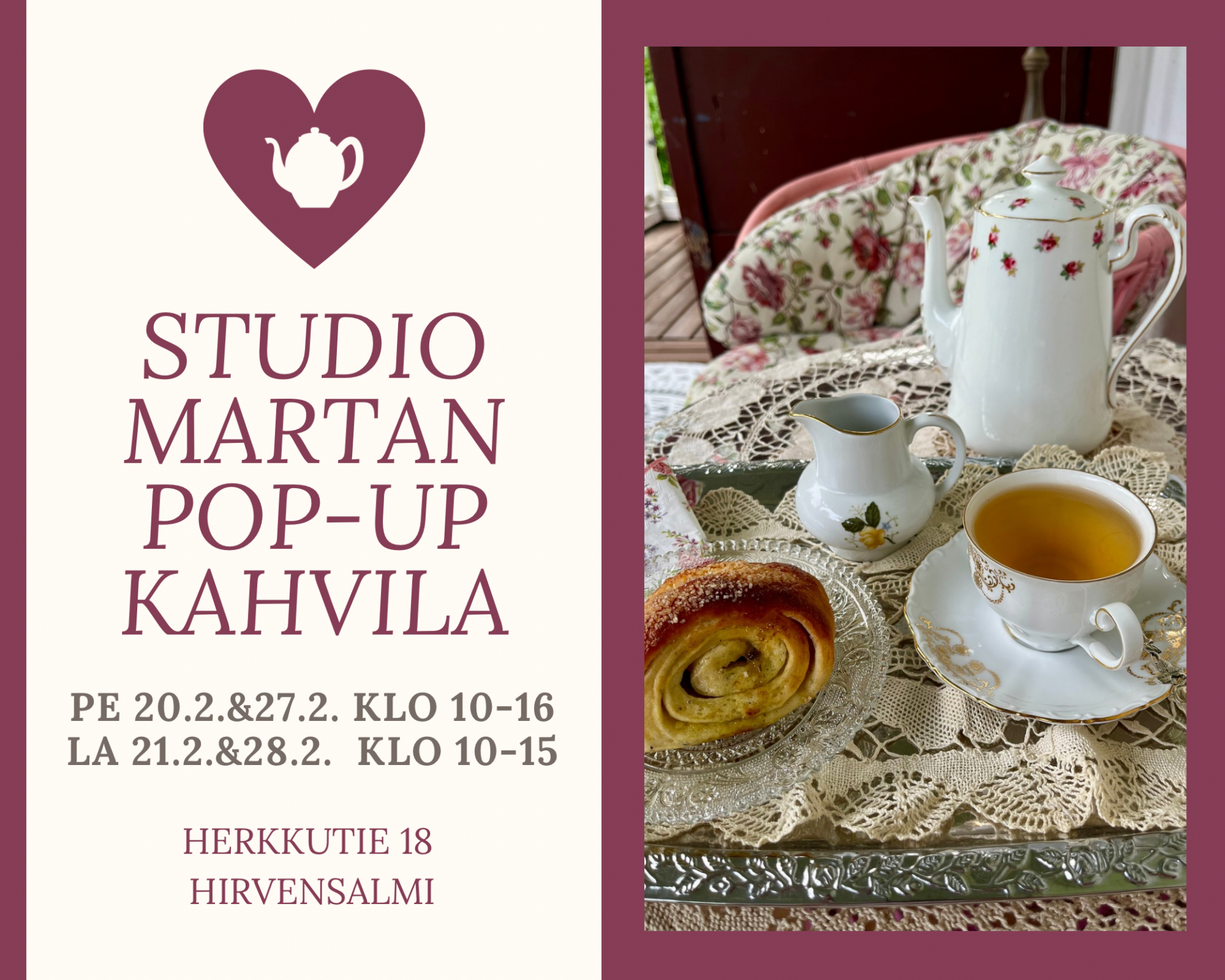 Studio Martta Herkkutie 18, Hirvensalmi, SuomiPoikkea ladulta tai tule muuten vaan herkuttelemaan kahvioon makeaa tai suolaista ja nauttimaan teetä, kahvia tai mehua. Myös vohveleita tarjolla! Maksuvälineeksi käy käteinen, kortti tai mobilepay.