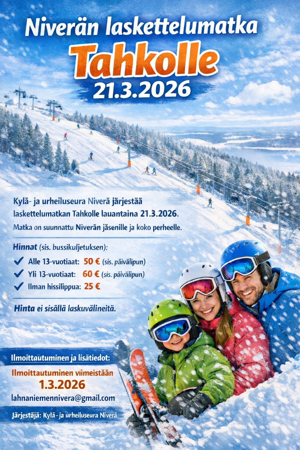 Kylä- ja urheiluseura Niverä järjestää bussimatkan Tahkolle 21.3.2026. Bussi lähtee Lahaniemen koululta. Ilmoittautuminen viimeistään1.3.2026. Lisätietoja ja ilmoittautumiset: Lahnaniemennivera@gmail.com