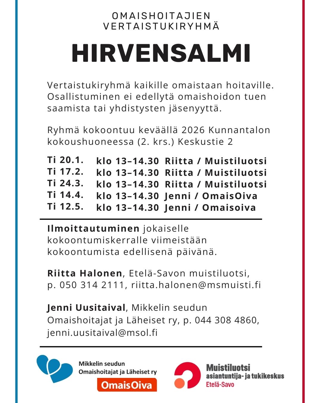 Vertaistukiryhmä kaikille omaistaan ja läheistään hoitaville Hirvensalmella. Vertaistukiryhmässä voit jakaa kokemuksia luottamuksellisessa ja ymmärtävässä ilmapiirissä toisten läheis- ja omaishoitajien kanssa. Arjen vinkit, ilot ja surut on helpompi kertoa, kun vertainen […]