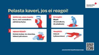 - Jos ei hengitä: Elvytä: 30 painallusta (2 puhallusta). Jos puhaltaminen jostain syystä ei ole mahdollista, jatka paineluelvytystä keskeytyksettä.